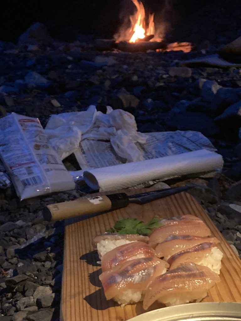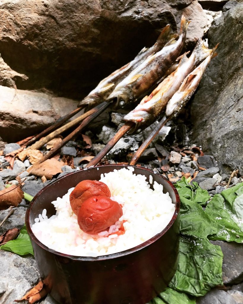 源流の食事。米を炊くときは、このようにイワナの握りすしにすることがあります。盛夏のイワナは、脂が乗って、ハマチのような味がするという人もいます。源流は、椅子やテーブルがないので、各自河原に座って食事です。
