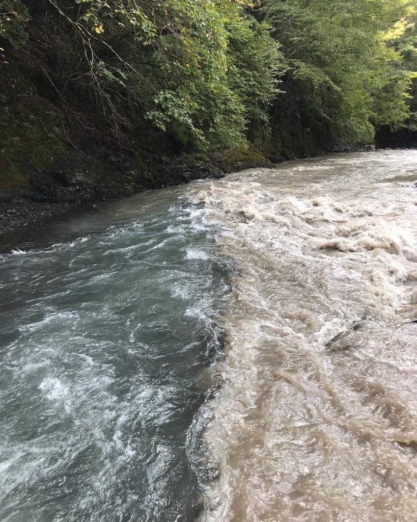 ゲリラ豪雨で沢はあっという間にこのように濁ります。左は支流の沢。こちらはゲリラ豪雨の影響を受けていません。局地的に大雨になるのも、ゲリラ豪雨の特徴ですね。