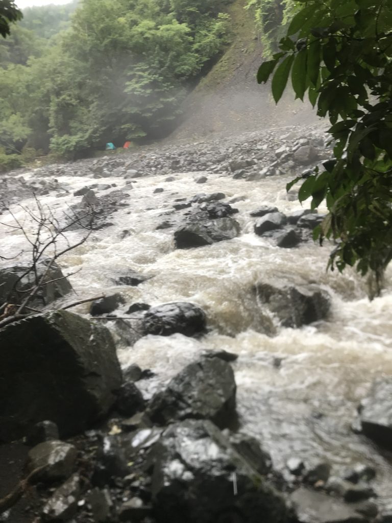ゲリラ豪雨の直撃をうけると、あっという間に水がふえて、停滞することとなります。左上に見えるテントは、他のパーティのもの。源流最深部で、他のパーティに出くわすことは、たまにあります。こういうときは、お互いに協力しあいます。