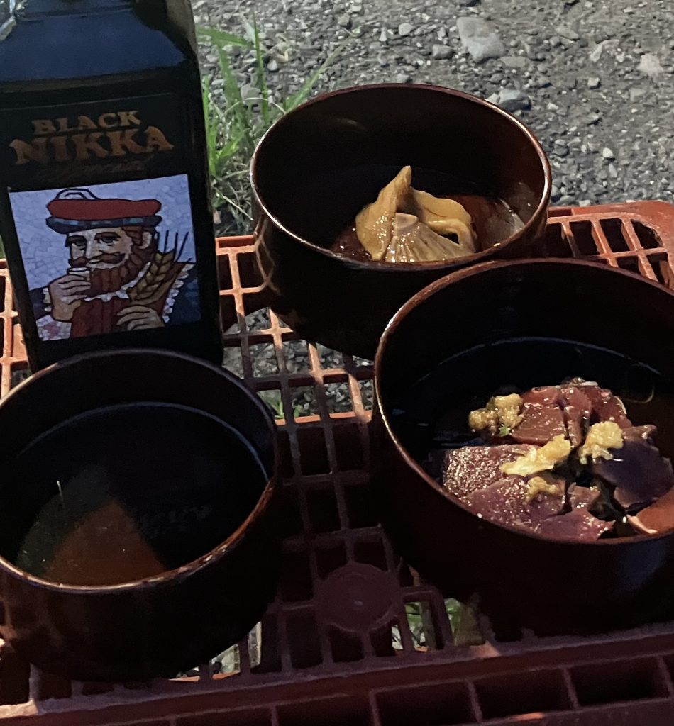 よく質問をいただいた「P箱」がこれ。ビールや清酒のケースですね。テーブルに、椅子に大活躍です。源流の宴では、このようにテーブルにして使います。めんぱという原始的な漆器には、鹿肉(有害駆除でとったもの)ときのこ。そしてウイスキー。